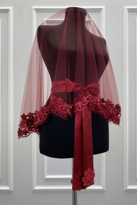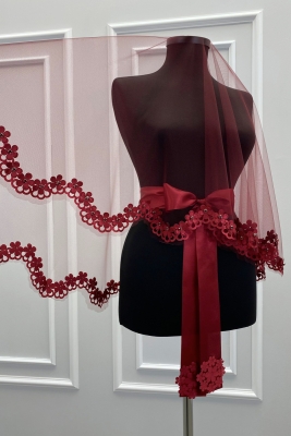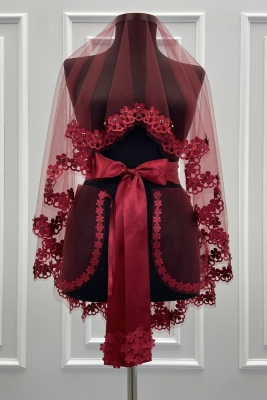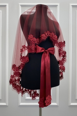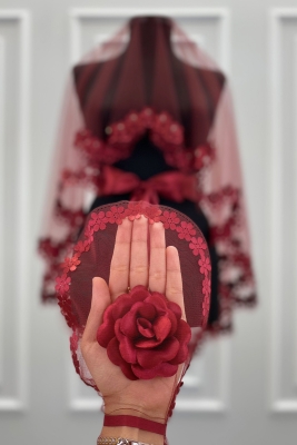 Bordo Gelin Duvak Seti, 3D Çiçek Ve Parlak Taşlı, Kına Gecesi Duvağı Yüz Örtüsü Seti 6 Parça