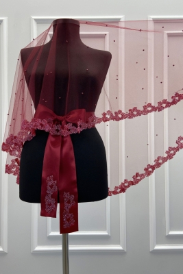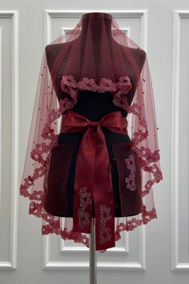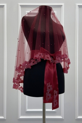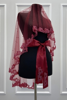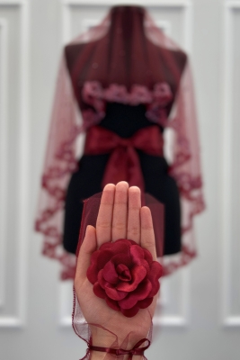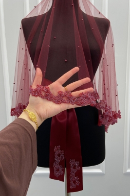 Bordo Gelin Duvak Seti, Cam Boncuk Ve İncili, Kına Gecesi Duvağı Yüz Örtüsü Seti 6 Parça