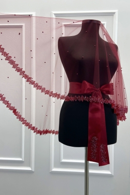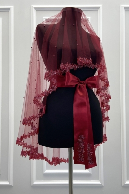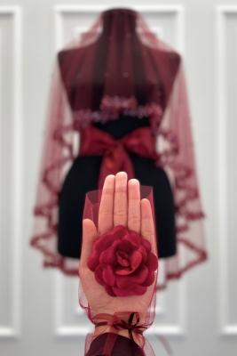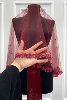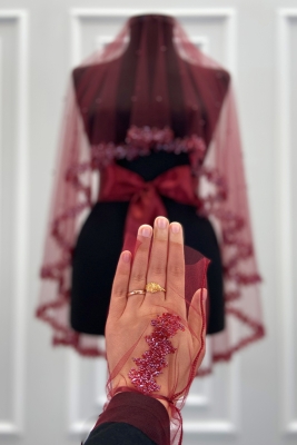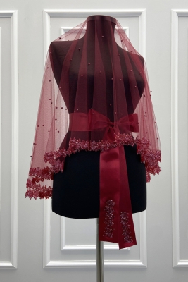 Bordo Gelin Duvak Seti, Cam Boncuk Ve İncili, Kına Gecesi Duvağı Yüz Örtüsü Seti 6 Parça