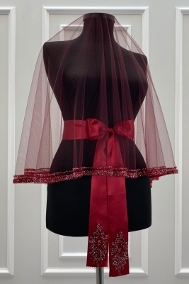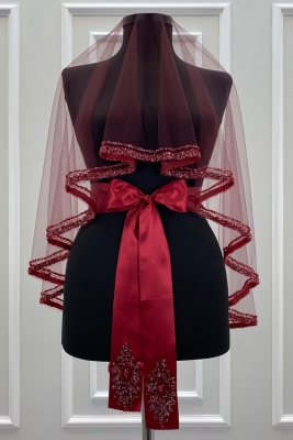 Bordo Gelin Duvak Seti, Cam Boncuk ve Pul Baskılı Kına Duvağı Yüz Örtüsü Seti 6 Parça