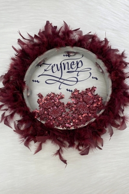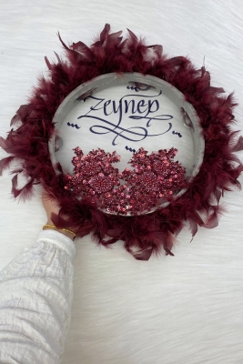 Bordo Ledli Şeffaf Kaligrafi Gelin Tefi 30cm Vip Güpürlü Ve Tüylü Düğün Kına Nedime Bride Parti