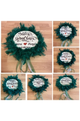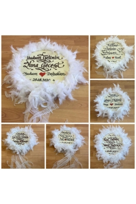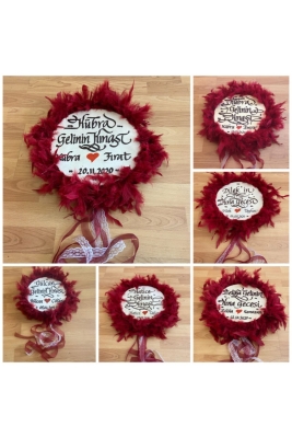 Gelin Tefi 30cm, Tüy Kurdele Kaligrafi Sanatlı, Kına Gecesi Düğün Bride Henna Bekarlığa Veda Defi