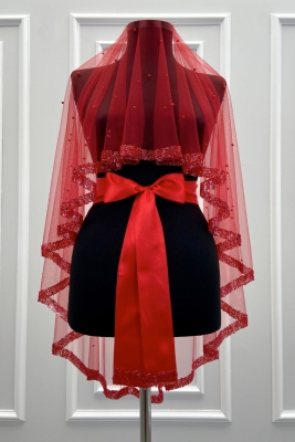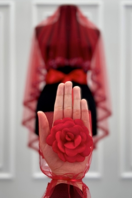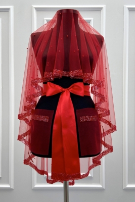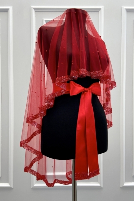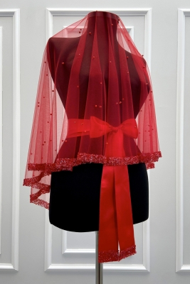 Kırmızı Gelin Duvak Seti, Cam Boncuk Ve İncili, Kına Gecesi Duvağı Yüz Örtüsü Seti 6 Parça