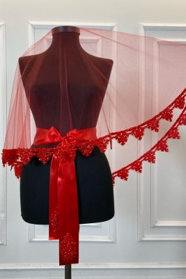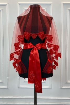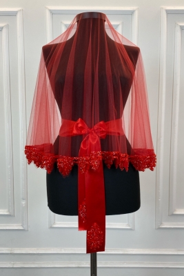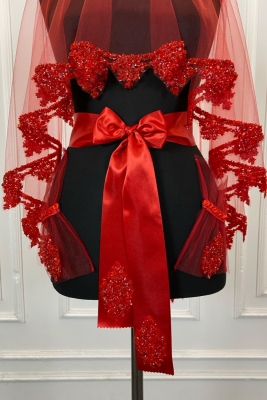 Kırmızı Gelin Duvak Seti, Cam Boncuk ve Pul Baskılı Kına Duvağı Seti 6 Parça