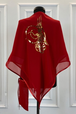 Kırmızı Şifon Lüks Damat Omuz Örtüsü, Gold Tuğra Baskılı, Sağdıç Nedime Kına Asker Şalı Duvağı
