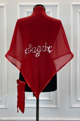 Kırmızı Şifon Sağdıç Omuz Örtüsü Şalı Üçgen Model, Gümüş Baskılı, Damat Sağdıç Asker Kına Örtüsü