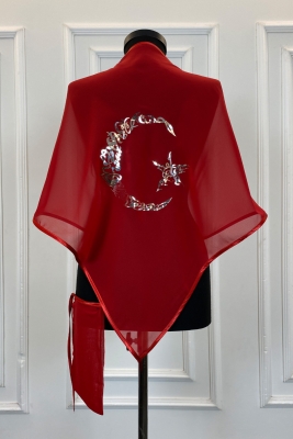 Kırmızı Şifon Üçgen Damat Omuz Örtüsü, Gümüş Ayyıldız Baskılı, Sağdıç Nedime Kına Asker Şalı Duvağı