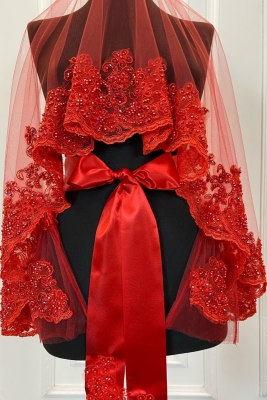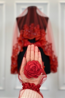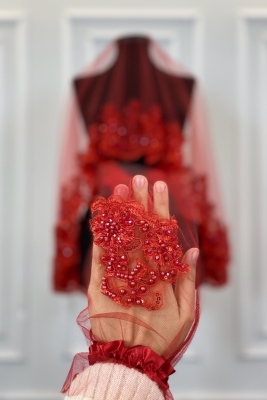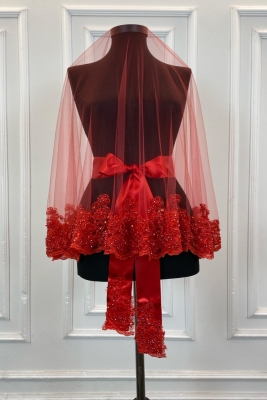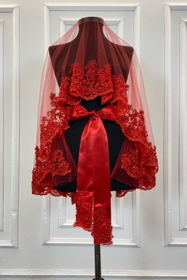 Kırmızı Vip Gelin Duvak Seti, Çiçek Güpürlü Cam Boncuk İnci Dikişli Kına Duvağı Örtüsü Seti