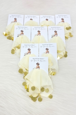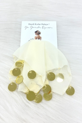 Krem Gold Şifon Kartlı Hediyelik Halay Mendili 10 Adet, Gelin Damat Düğün Kına Sünnet Nişan Bride