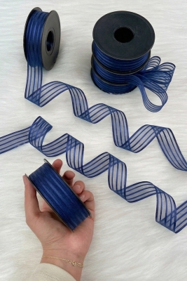 Lacivert Hilton Çizgili Şifon Kurdele 2,5 cm 20 mt, Gelin, Bohça, Nişan, Çeyiz, Hediye Nikah Süsleme