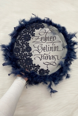 Lacivert Ledli Şeffaf Gelin Tefi 32cm 3d Çiçek Parlak Taş Otrişli Düğün Kına Nedime Bride Parti Defi