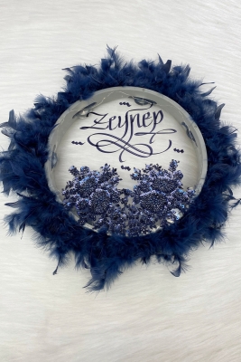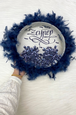 Lacivert Ledli Şeffaf Kaligrafi Gelin Tefi 30cm Vip Güpürlü Ve Tüylü Düğün Kına Nedime Bride Parti