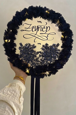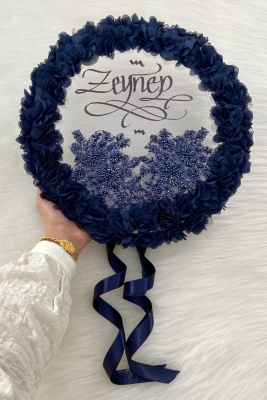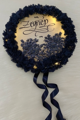 Lacivert Ledli Şeffaf Kaligrafi Gelin Tefi 32cm Vip Güpür Ve Çiçek Düğün Kına Nedime Bride Parti