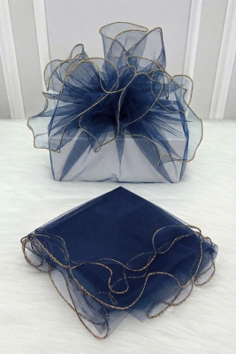 Lacivert Süsleme Tülü Gold Kenarlı, Bohça Çeyiz Gelin Damat Nişan Nikah Valiz Hediye Süsü 100x100cm