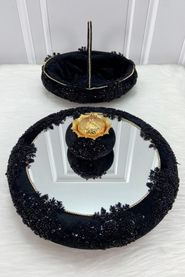 Siyah Vip Aplikli Aynalı Kadife Kına Gecesi Tepsisi Gelin, Nişan Nikah Düğün Söz Sünnet