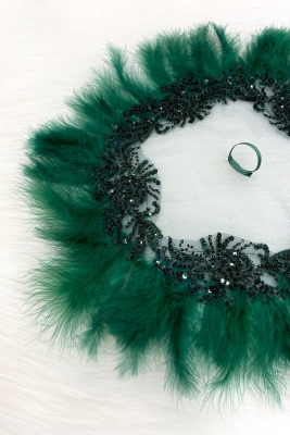 Yeşil Vip Gelin Mendili, Boncuk İnci Pul Tüy Detaylı Lüks Aplikli Damat Düğün Kına Sünnet Nişan